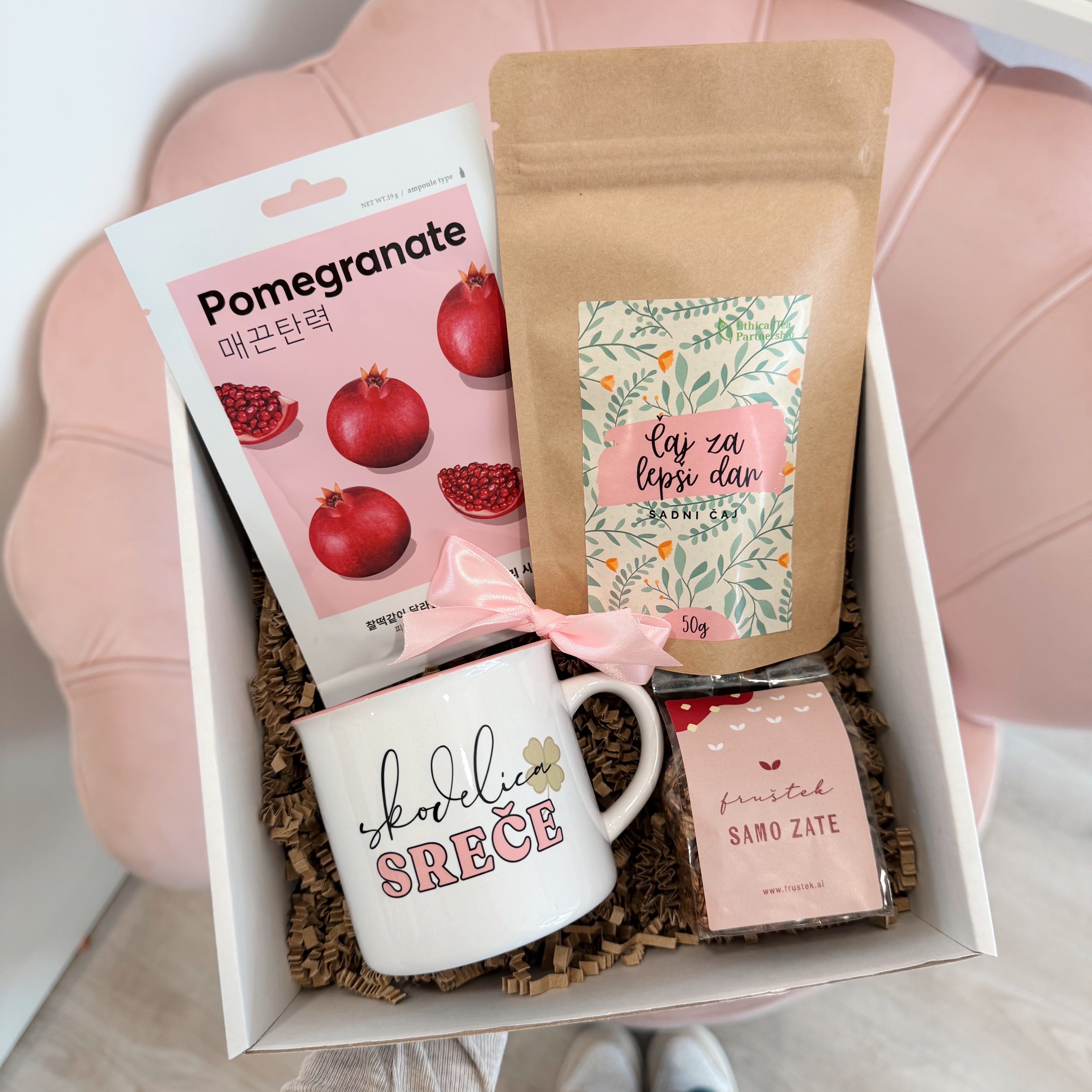 Če sami izberete vsebino, torej posamične produkte, pa morate v košarico dodati še darilno pakiranje. Pri opombah lahko dopišete tudi posvetilo za kartico / voščilnico. 💗